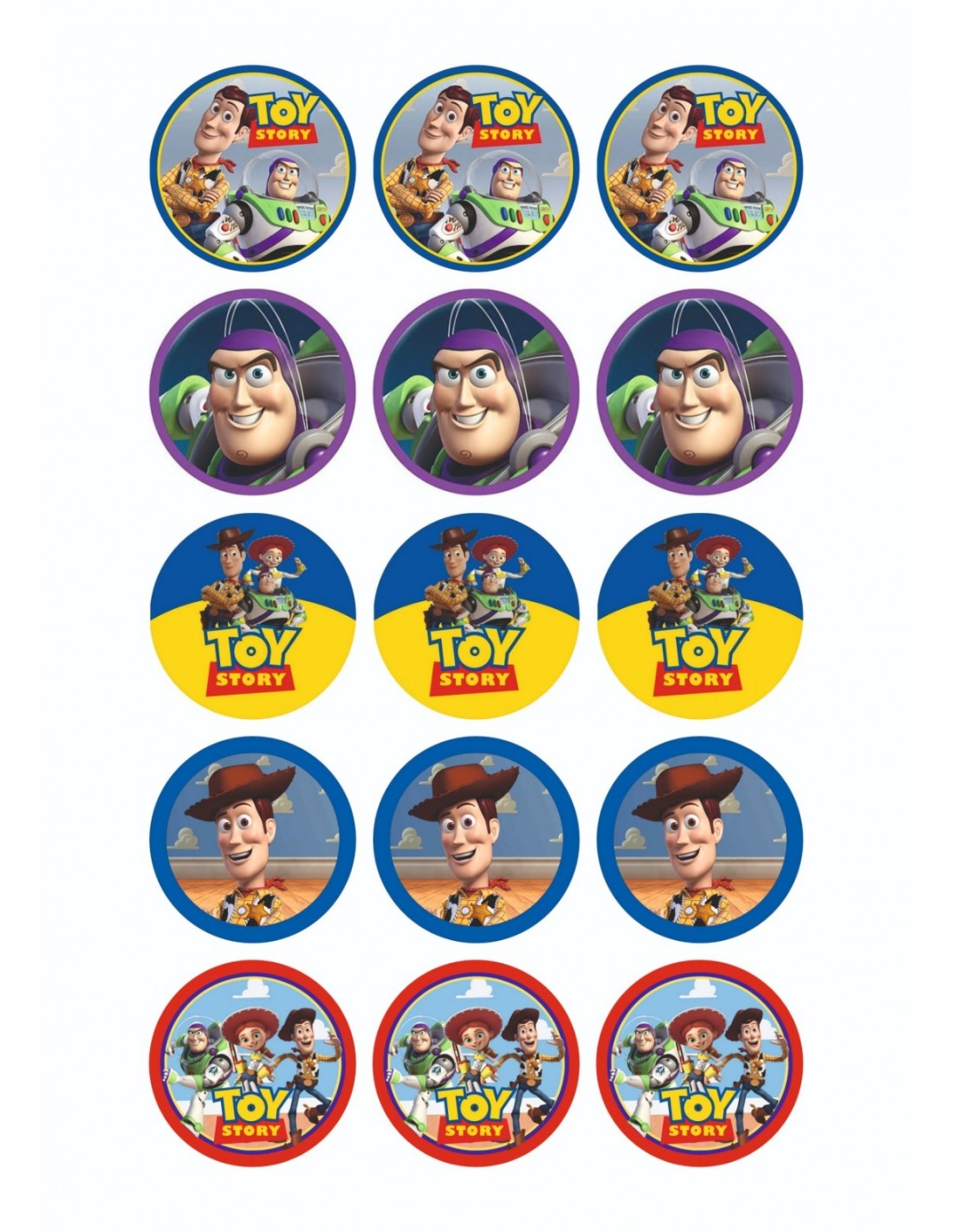 Hoja de papel de azúcar impresa con tinta comestible de Toy Story, para personalizar tartas, cupcakes y galletas.