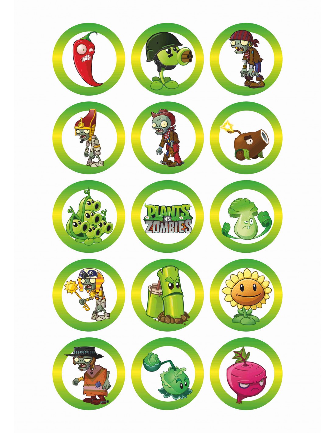 Hoja de papel de azúcar impresa con tinta comestible con dibujos de los personajes de Plantas Vs Zombies, para personalizar tartas, cupcakes y galletas.