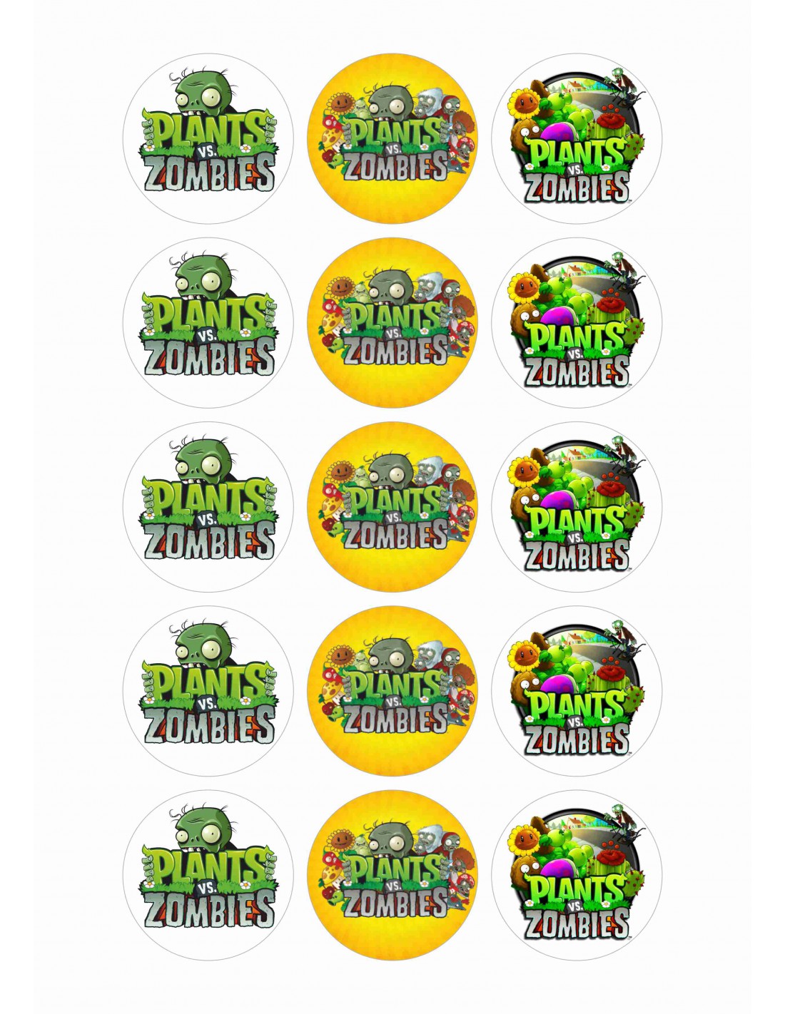 Hoja de papel de azúcar impresa con tinta comestible con dibujos de los personajes de Plantas Vs Zombies, para personalizar tartas, cupcakes y galletas.