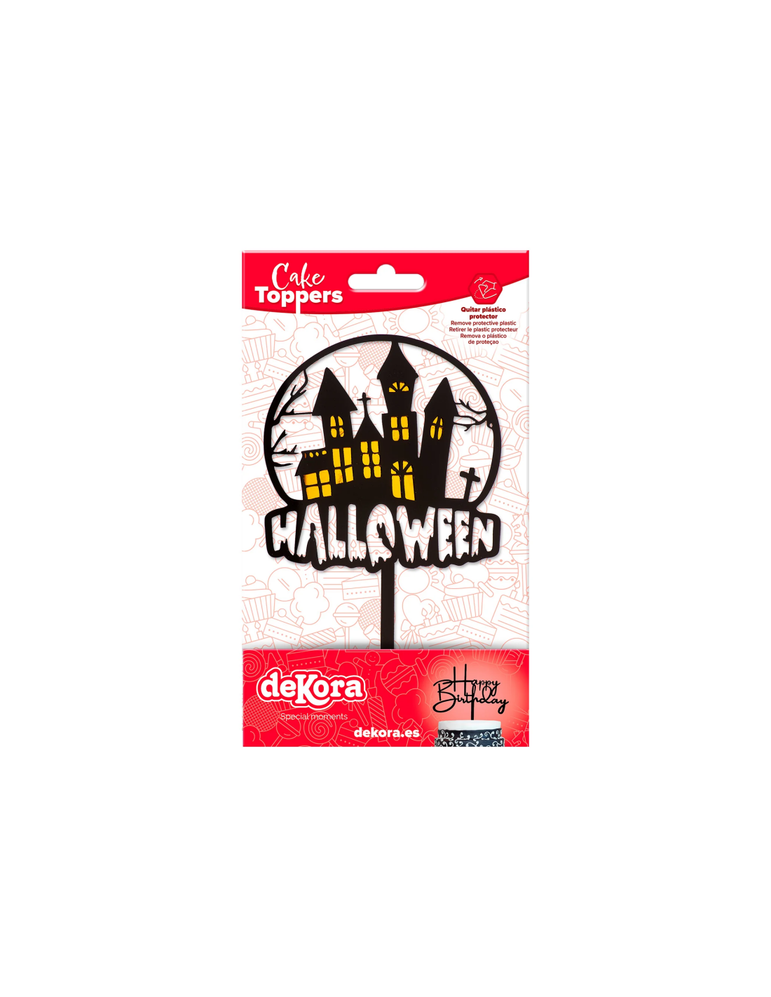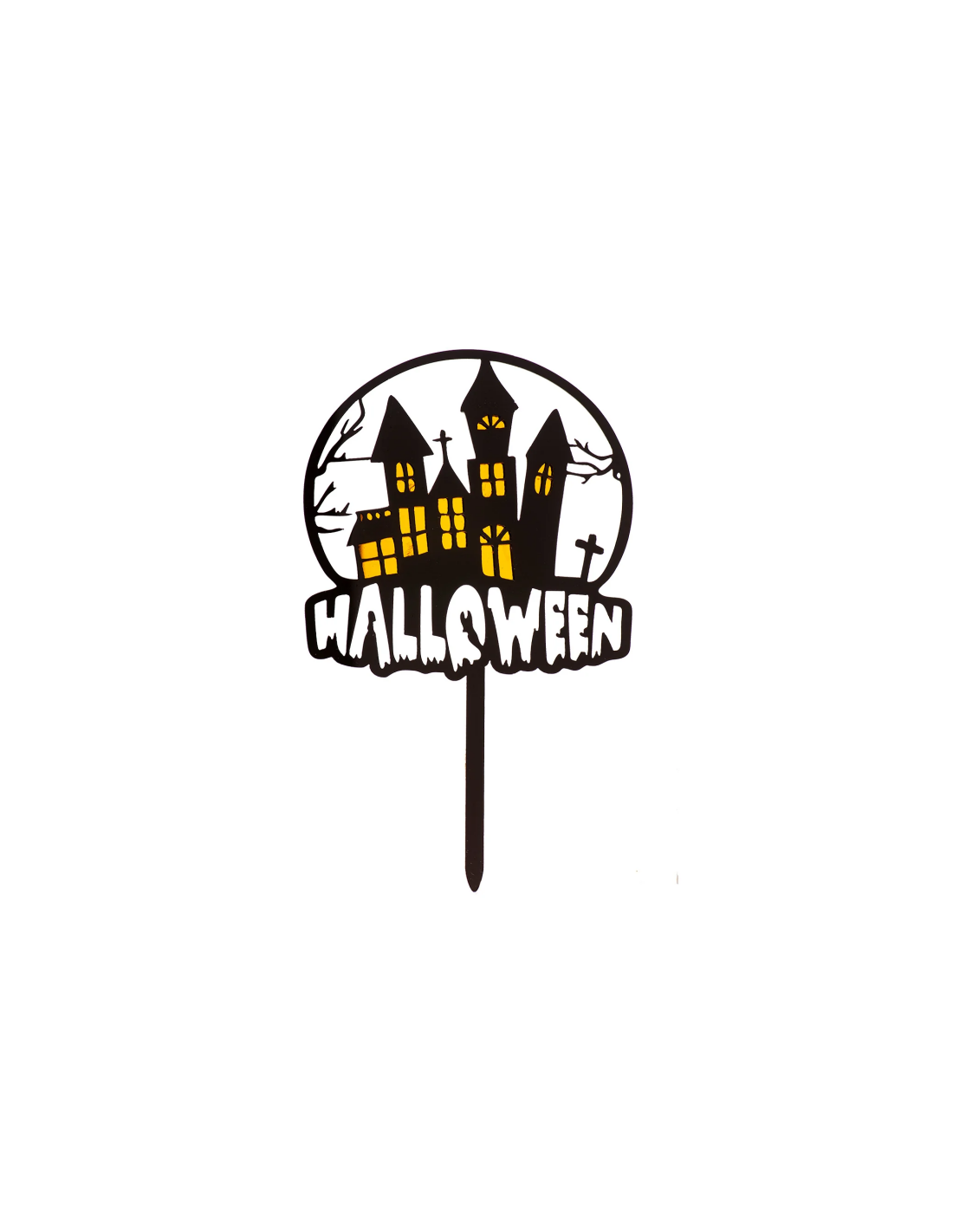 Topper para tartas Halloween con figura de Casa Encantada en color negro con ventanas doradas ideal para tus tartas más terroríficas.