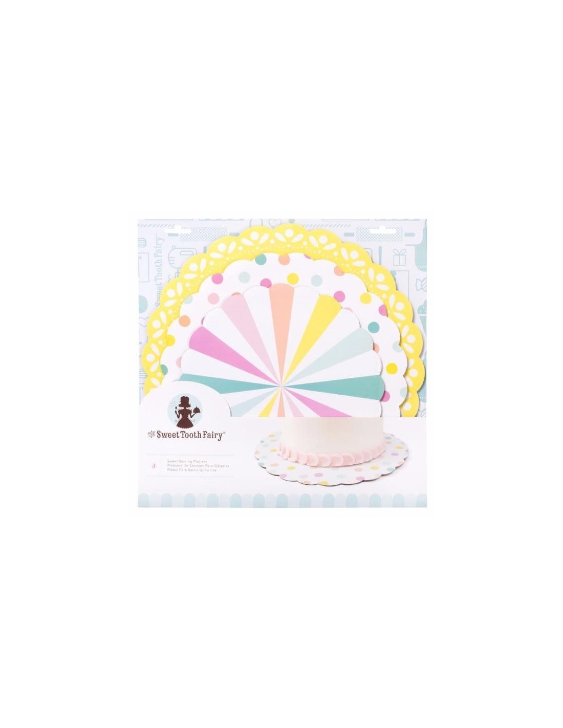 Set de tres bases de carton para tartas con varios tamaños y diseños con borde festoneado.