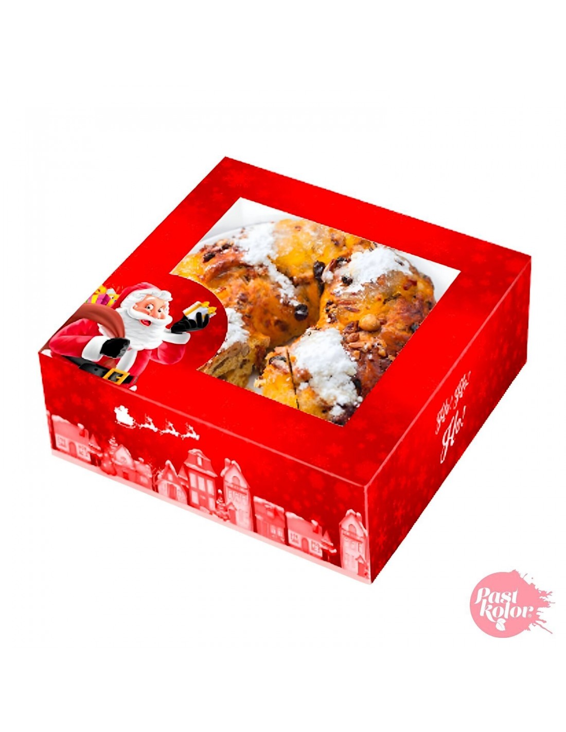Caja con ventana de Navidad con bonito diseño de Santa Claus es ideal para transportar o regalar tus roscones, dulces o tartas estas navidades.