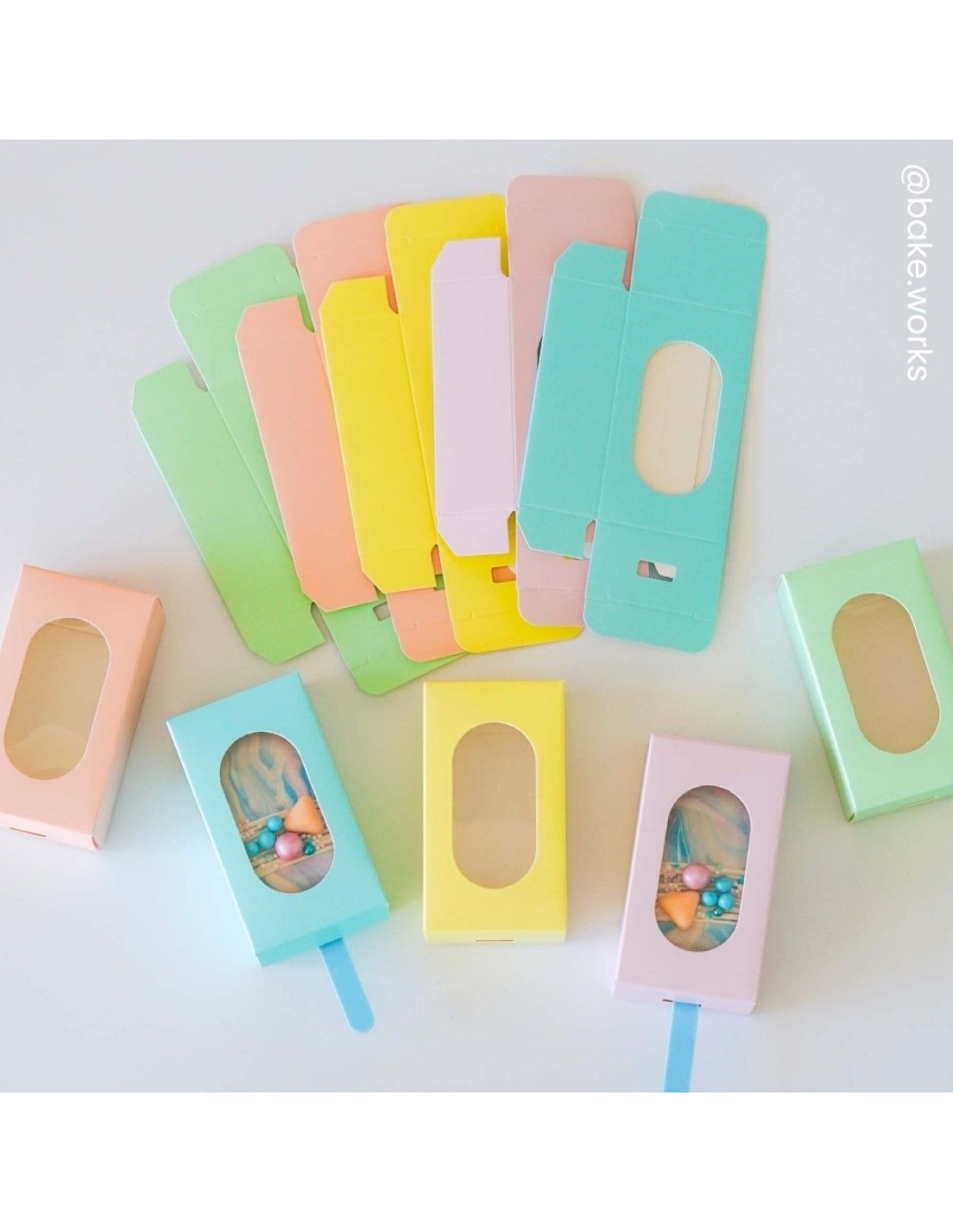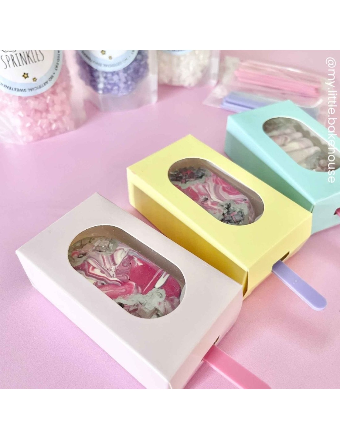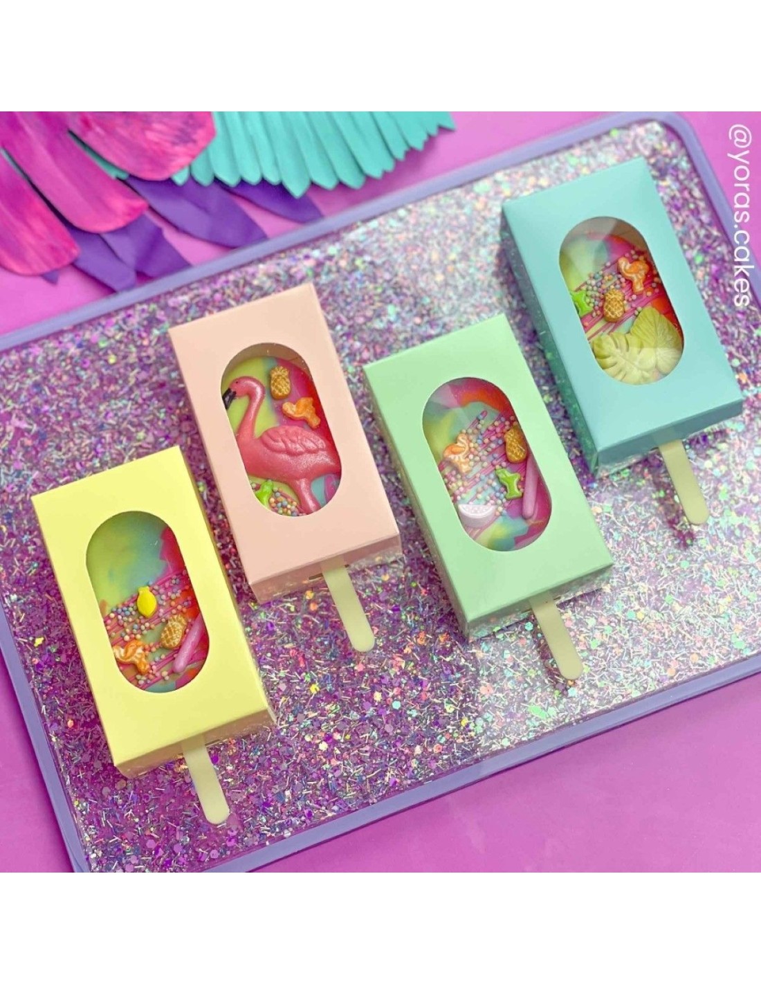 Cajita para paletas o helados tiene un fabuloso acabado brillante en color amarillo pastel, perfecto para presentar tus diseños de dulces con palito en todo su esplendor.