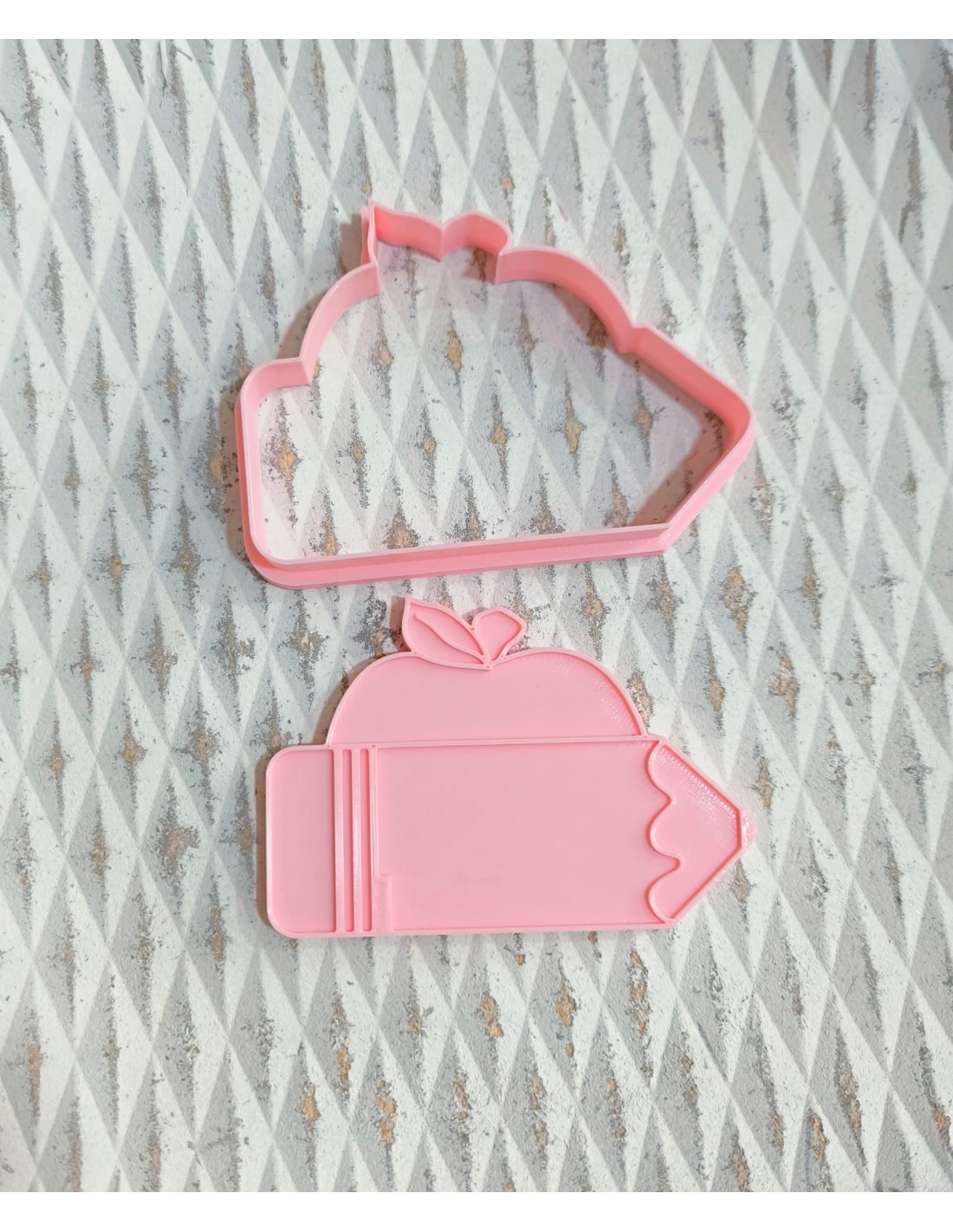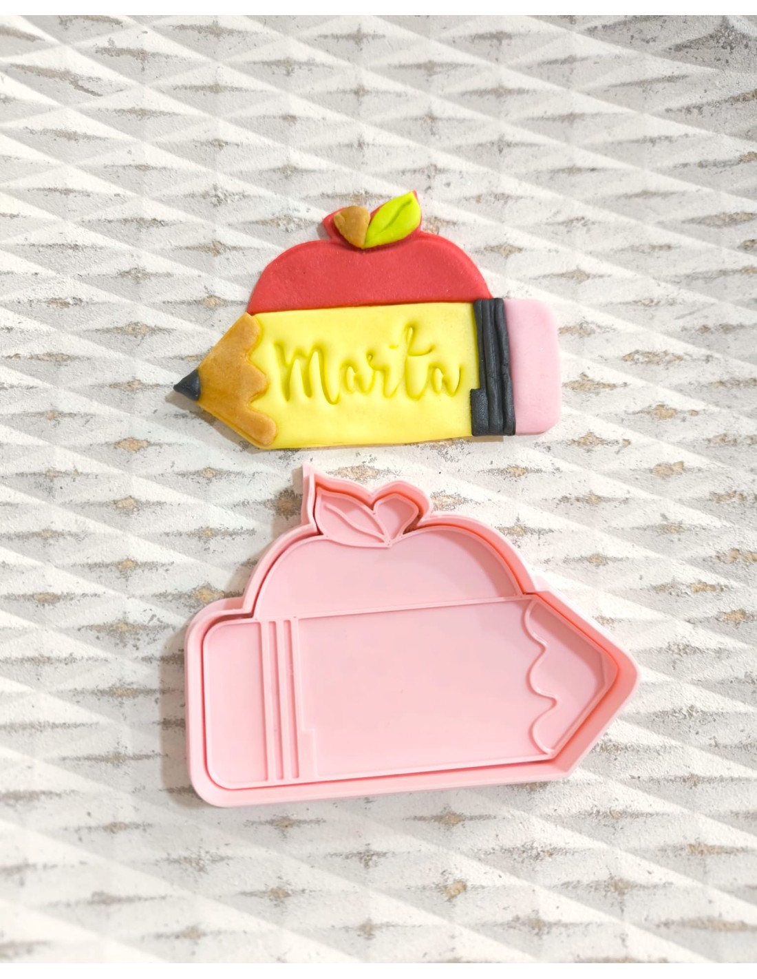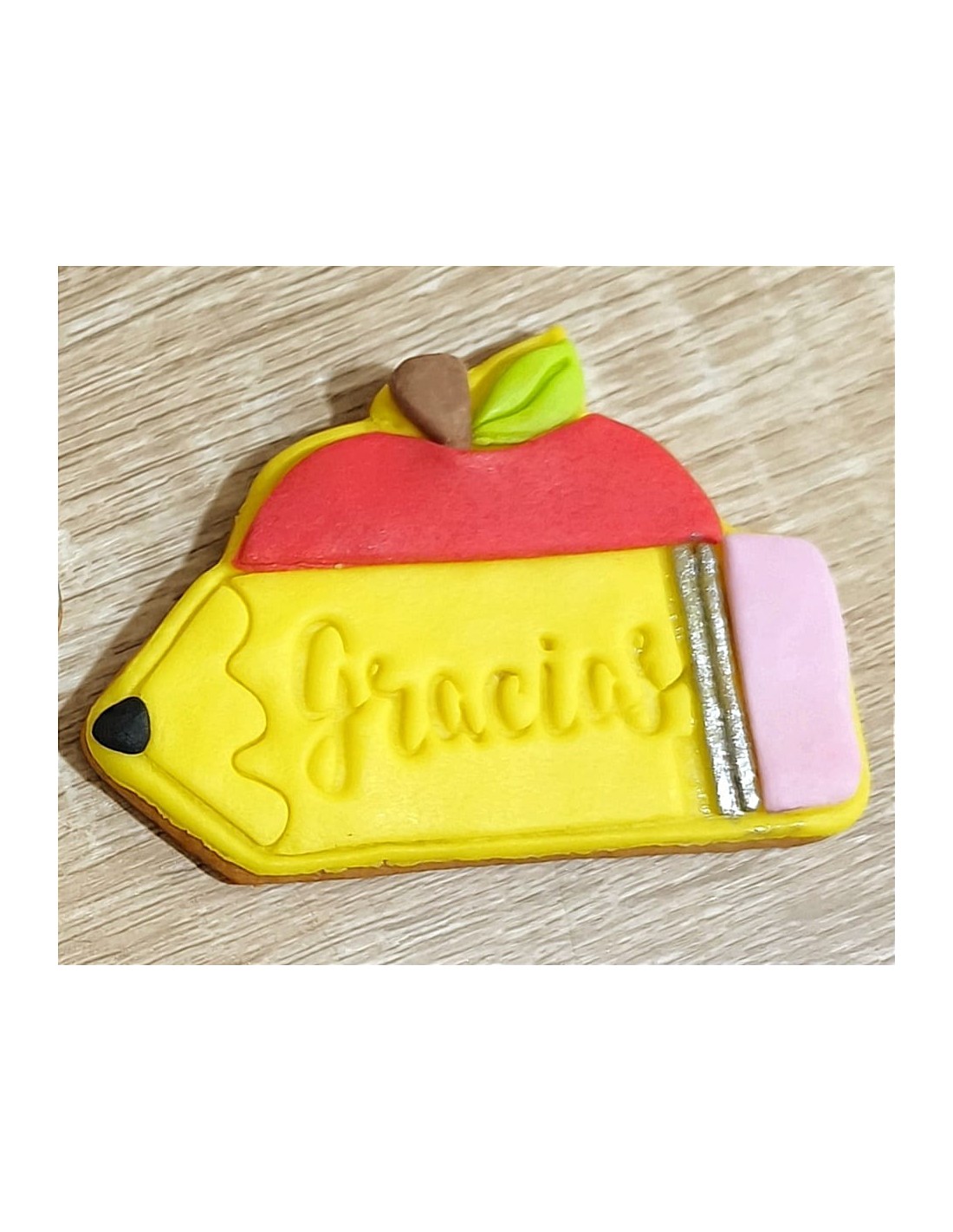 Cortador con forma de Lápiz con Manzana, muy fácil de utilizar y perfecto para cortar fondant y decorar galletas de profes.