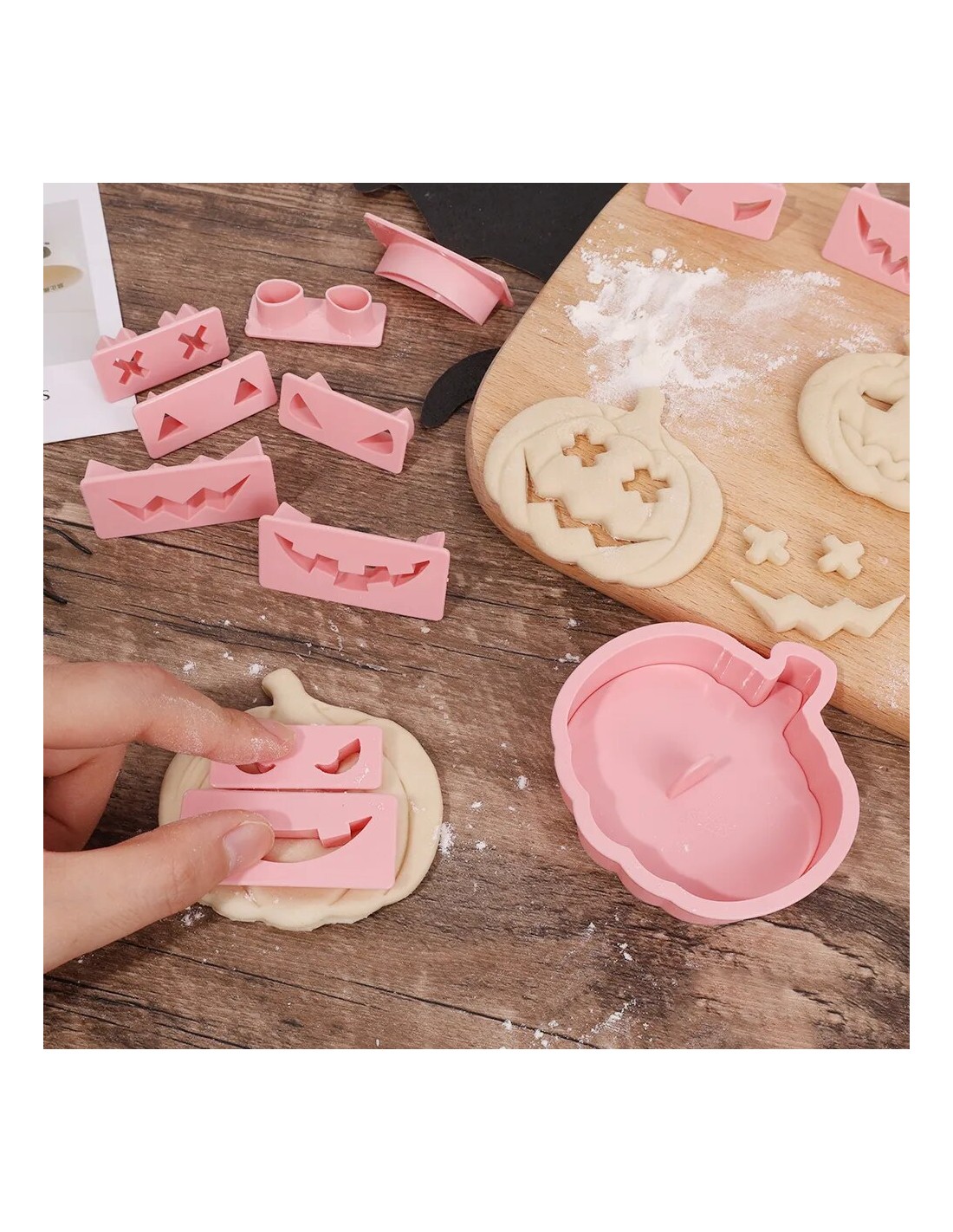 Contiene: un cortador con forma de calabaza, un marcador de calabaza, 6 marcadores de bocas, 6 marcadores de ojos.