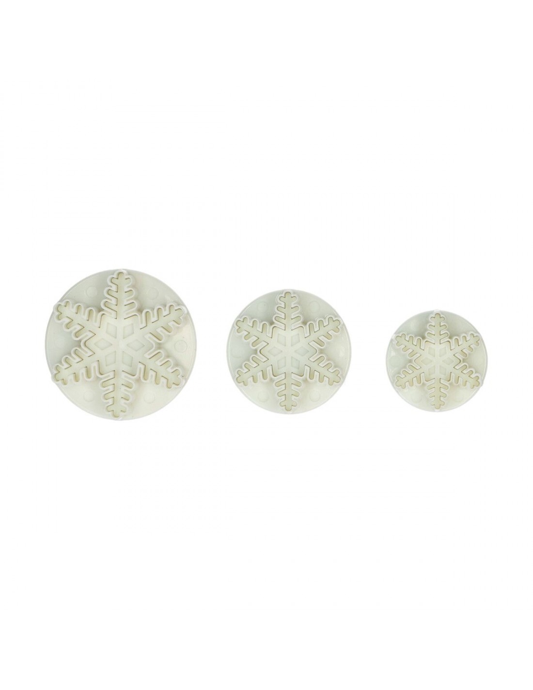 Con este set de 3 cortadores con expulsor en forma de copo de nieve podrás crear preciosas galletas y decoraciones de fondant con un acabado nítido y detallado. Gracias al expulsor, cada copo se libera fácilmente, manteniendo todos sus relieves intactos y listos para colocar en tus postres.