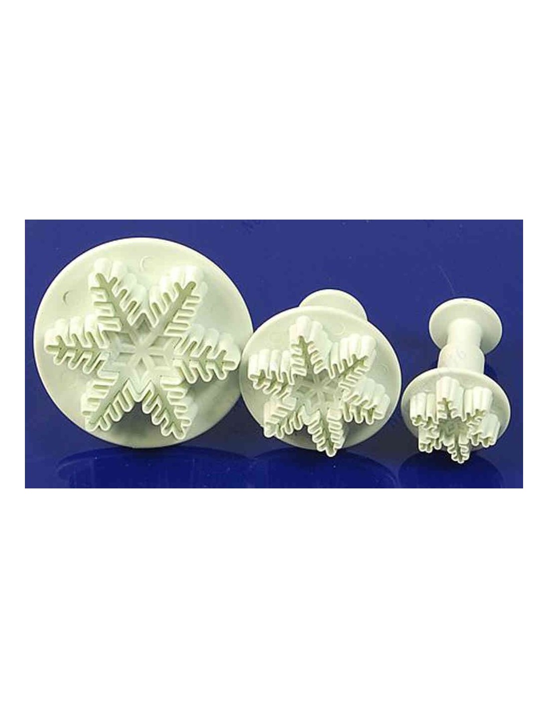 Con este set de 3 cortadores con expulsor en forma de copo de nieve podrás crear preciosas galletas y decoraciones de fondant con un acabado nítido y detallado. Gracias al expulsor, cada copo se libera fácilmente, manteniendo todos sus relieves intactos y listos para colocar en tus postres.