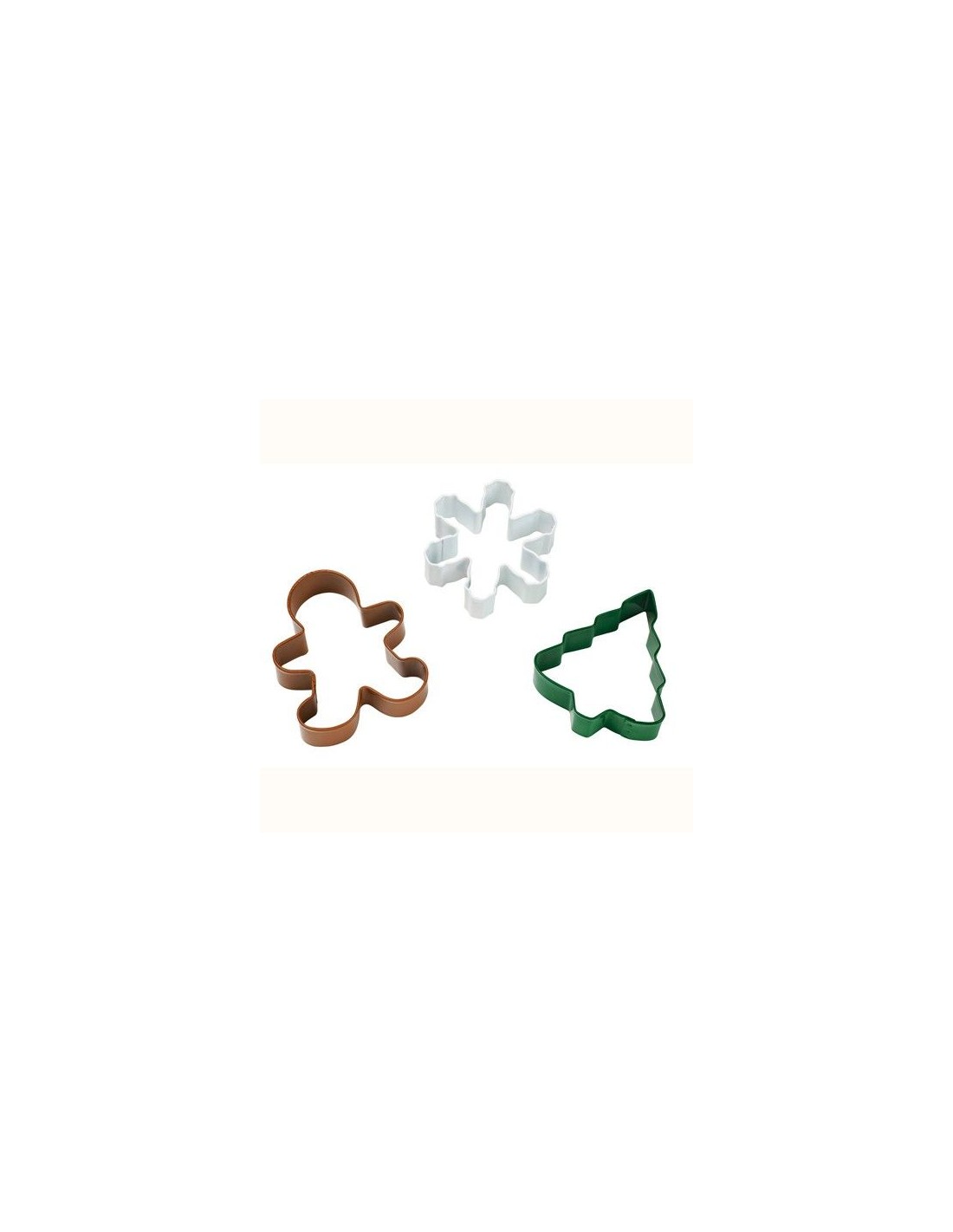 Haz divertidas galletas navideñas con este set de 3 cortadores con forma de abeto, muñeco dejengibre y copo de nieve con alegres revestimientos de colores y con temática invernal.