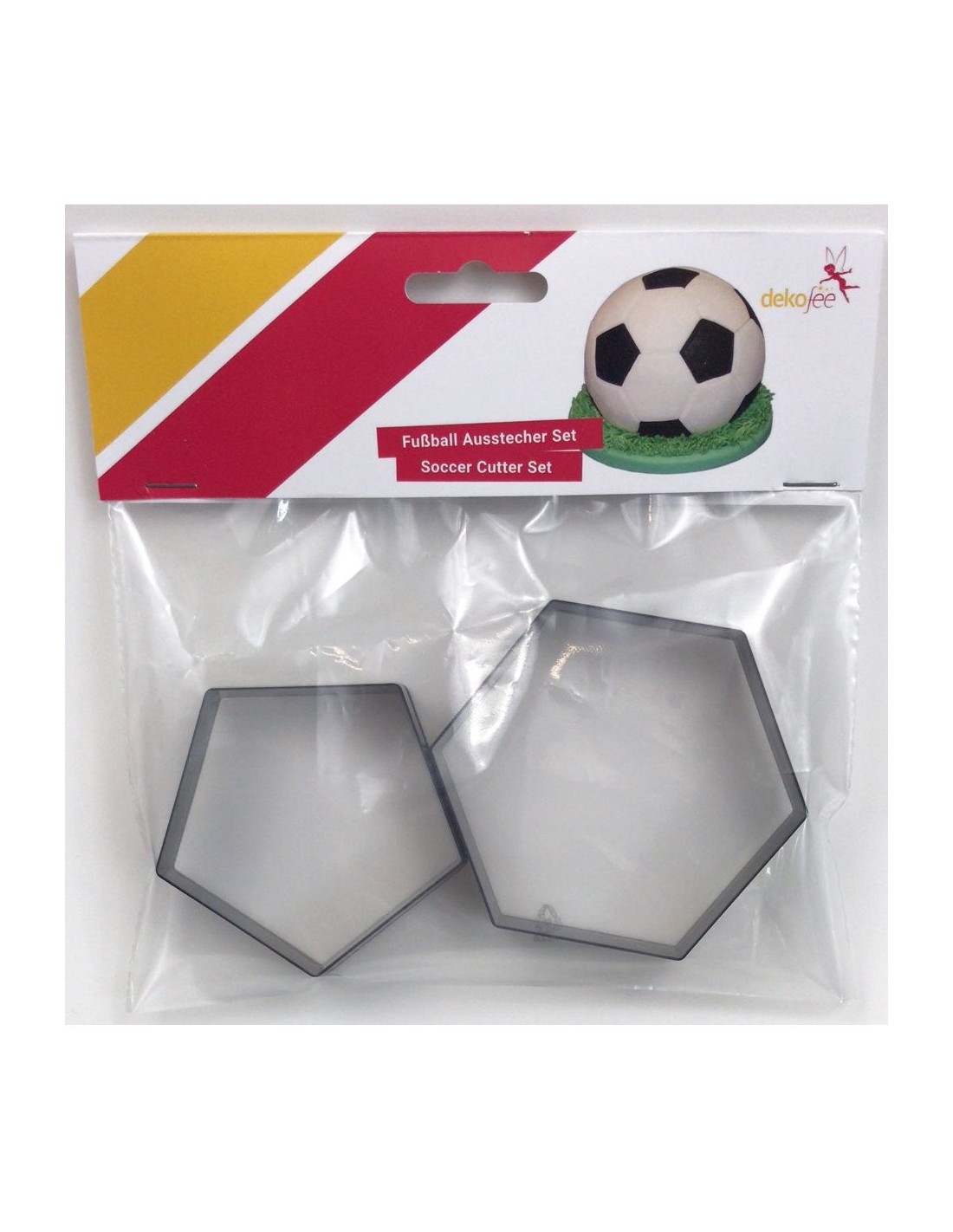 El set incluye 2 cortadores con forma de hexagono y pentágono y es perfecto para decorar una tarta con forma de balón de 20 cm. aprox.