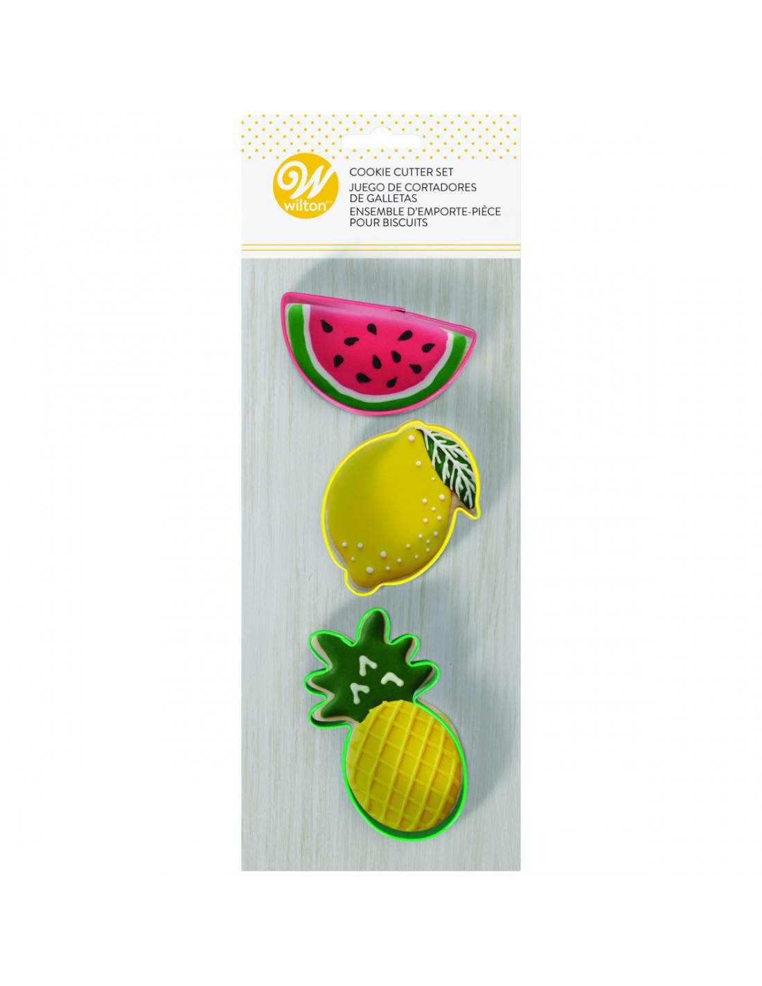 Set de 3 cortadores metálicos con formas de frutas (limón, sandia y piña) para hacer divertidas galletas.