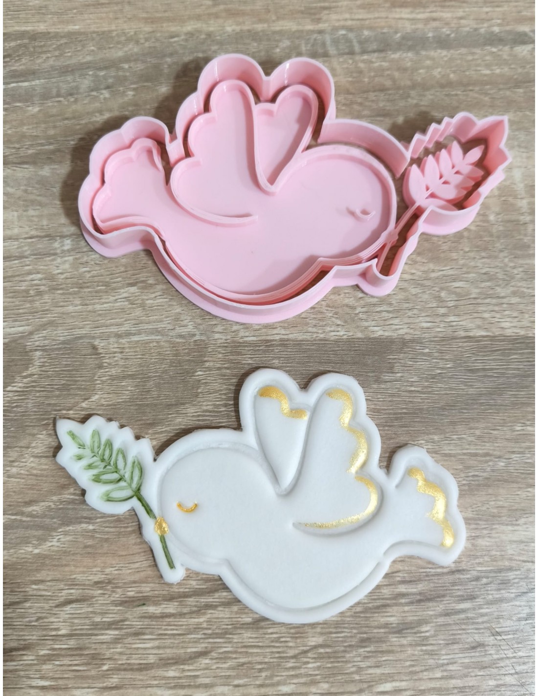 Cortador + marcador Paloma con Hojas de Olivo, muy fácil de utilizar y perfecto para cortar o marcar galletas o fondant.