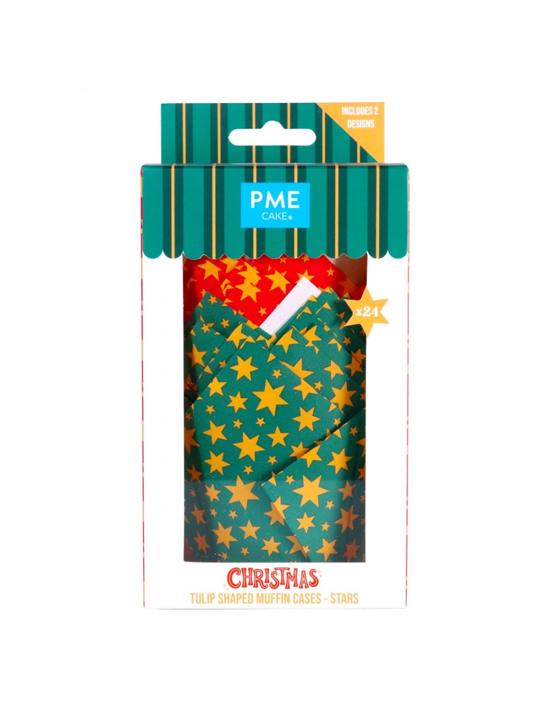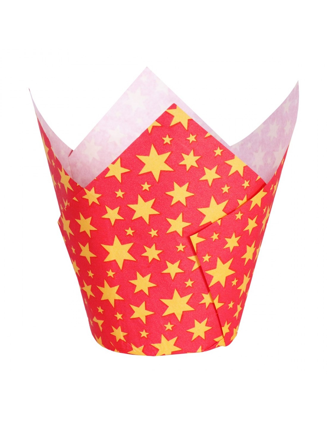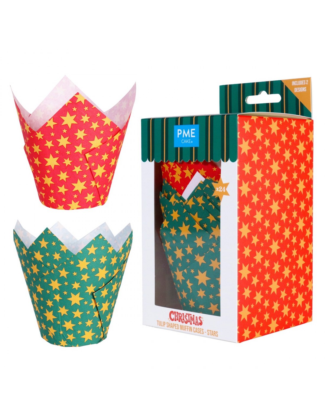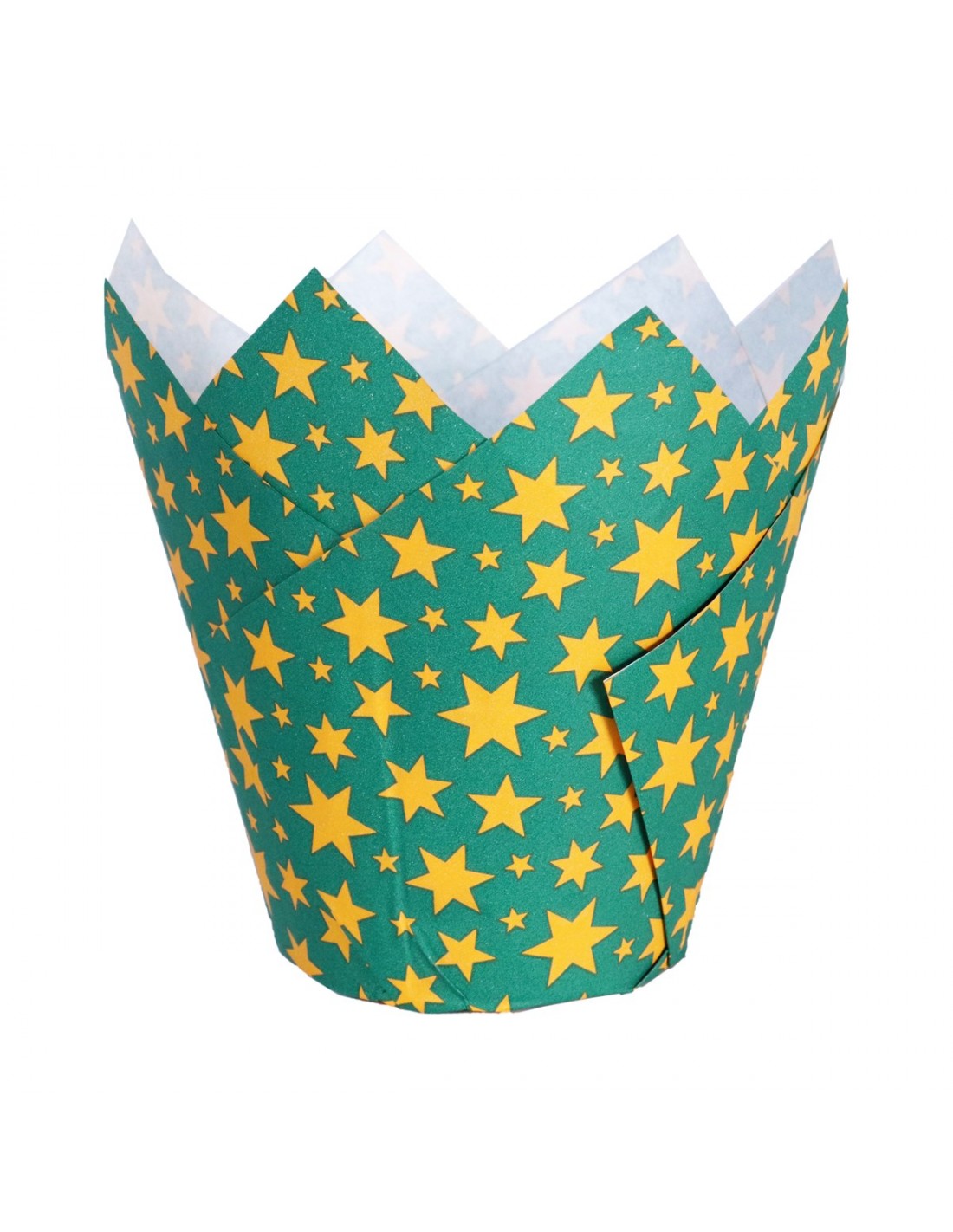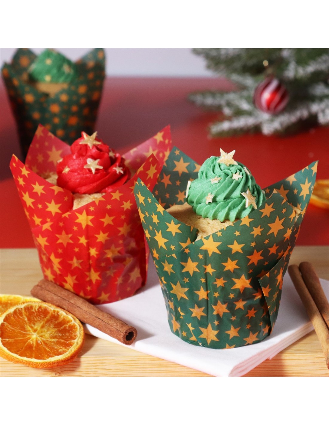 Pack de 24 cápsulas para muffins de Estrellas. Contiene dos diseños diferentes, 12 cápsulas verde con estrellas doradas, y 12 cápsulas rojo con estrellas doradas.