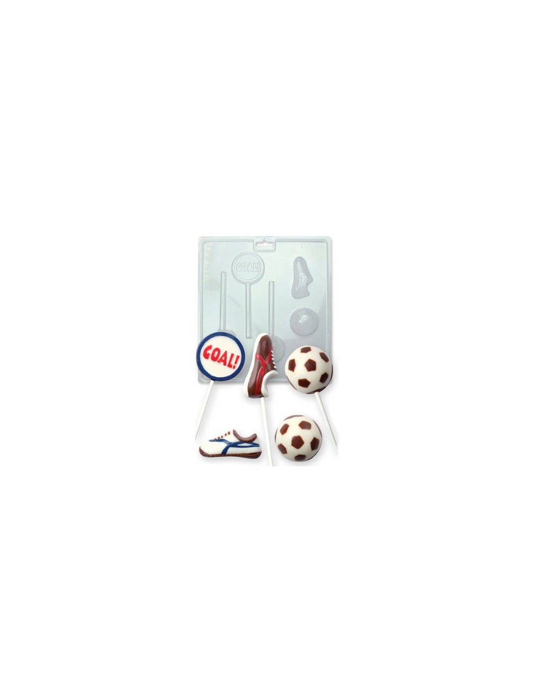 El molde contiene 5 cavidades, 3 para hacer piruletas y dos para hacer bombones, con formas de botas, balones y señal de gol.