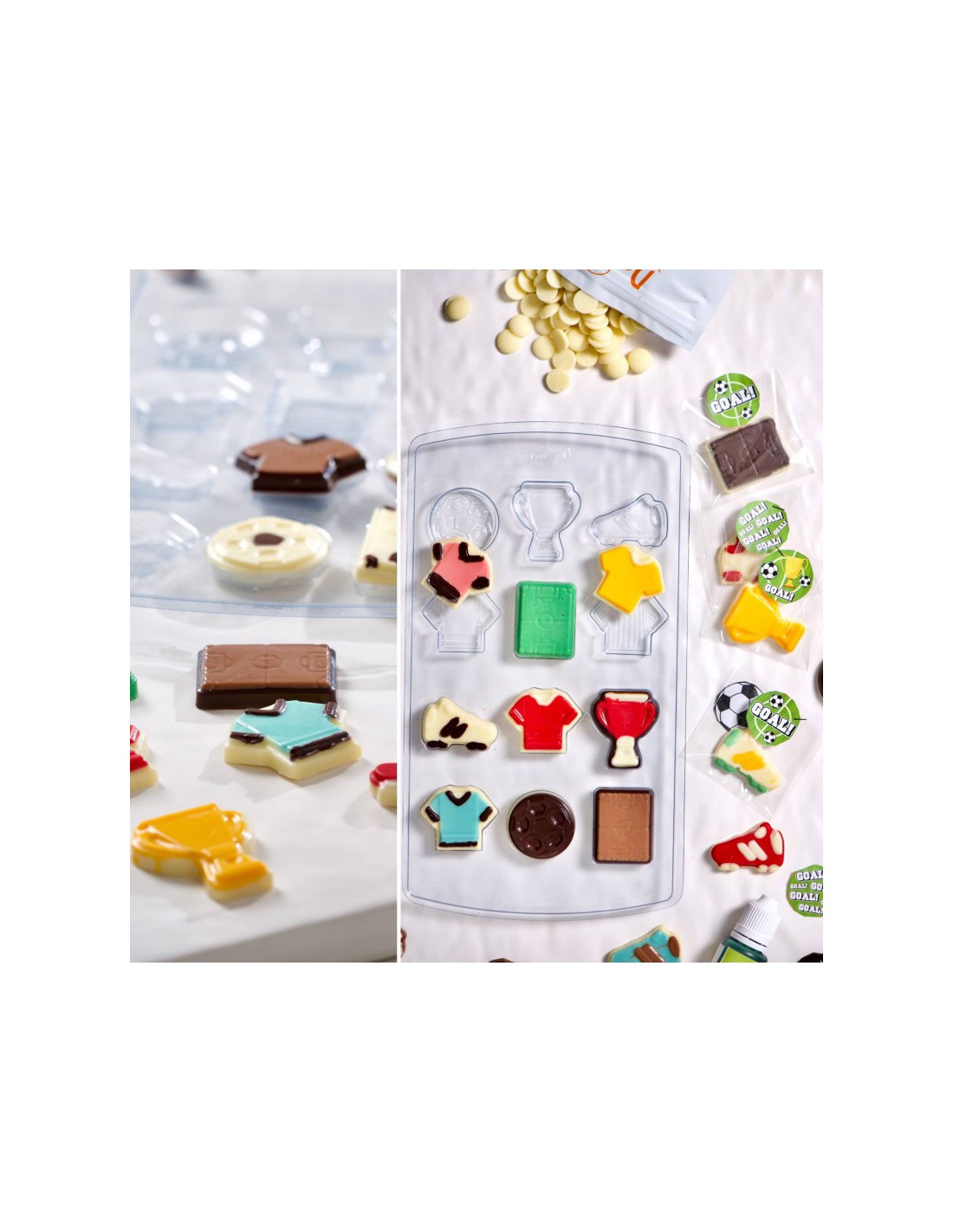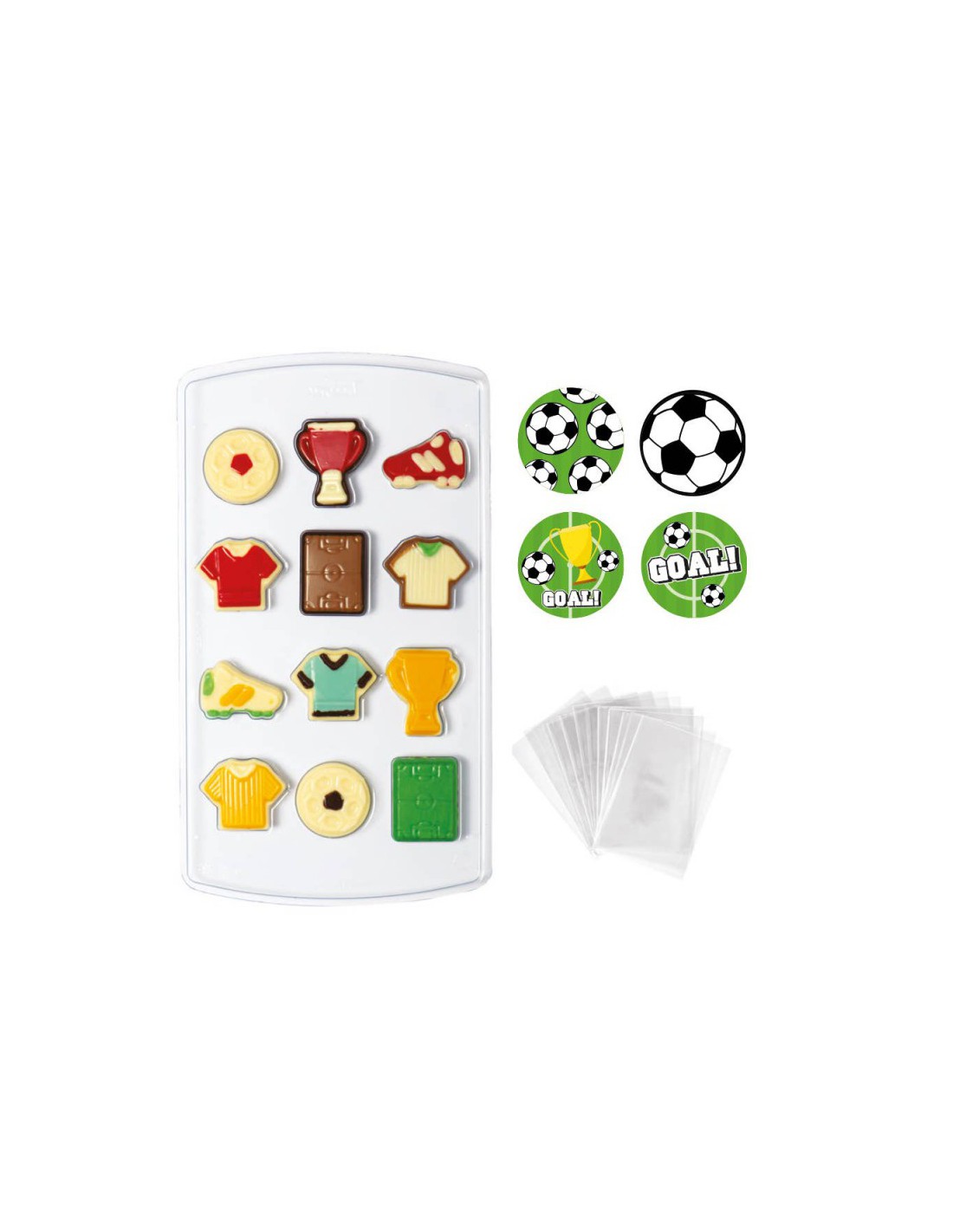 Moldes termoformados para alimentos para hacer bombones con formas de fútbol. También incluye 40 bolsitas transparentes y 40 pegatinas para embolsar cada chocolatina.