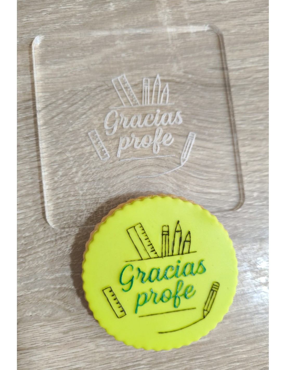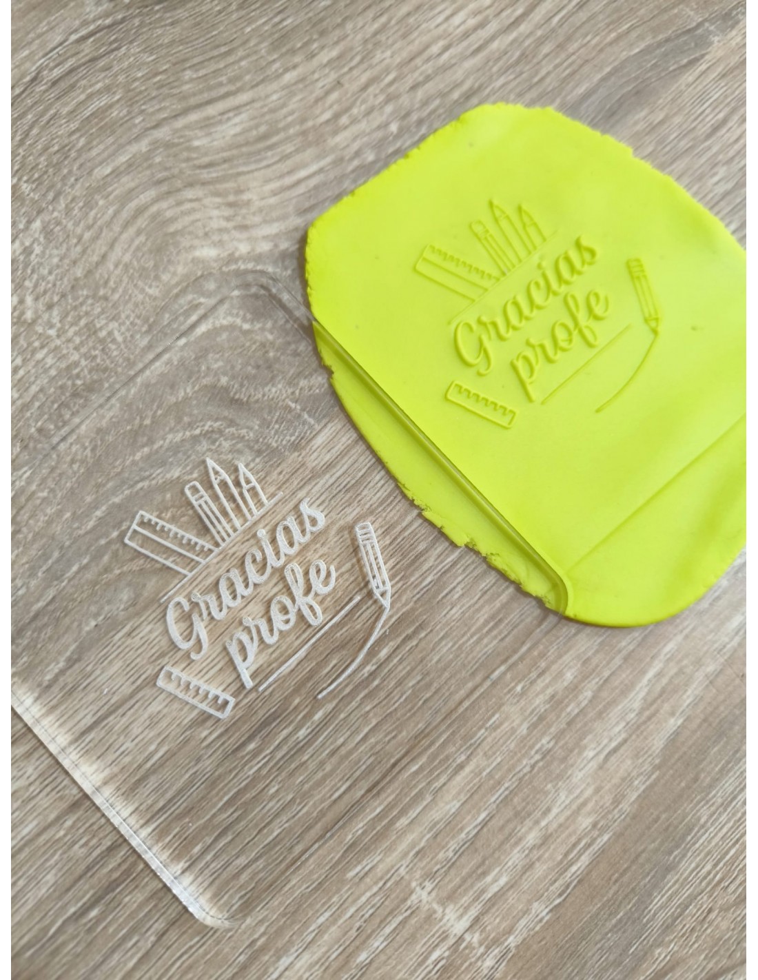 Sello para fondant con mensaje Gracias Profe ideal para galletas escolares o para profesores.... Está fabricado en metacrilato transparente apto para alimentación.