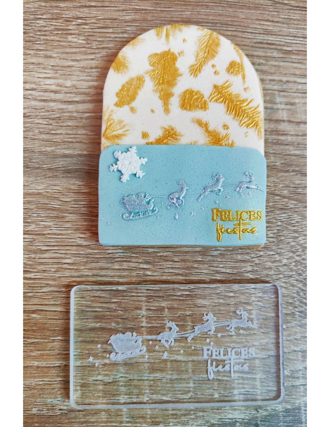 Sello para galletas con un bonito diseño de trineo con renos y el texto Felices Fiestas. Está fabricado en metacrilato transparente apto para alimentación.